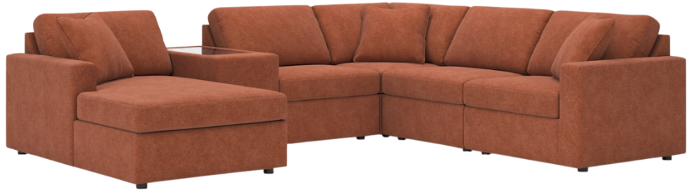 Includes 6 Modular Pieces: Left-arm facing corner chaise, 2 armless chairs, console with storage, wedge and right-arm facing corner chair