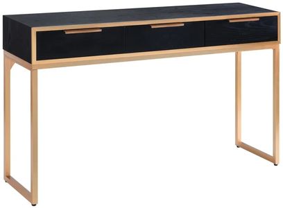 This stylish vanity table blends modern elegance with practical storage, featuring a sleek ebony finish accented by refined gold hardware. Its clean-lined silhouette and mixed wood-and-metal construction create a sophisticated focal point, ideal for bedrooms or dressing areas seeking both function and luxury.Read More